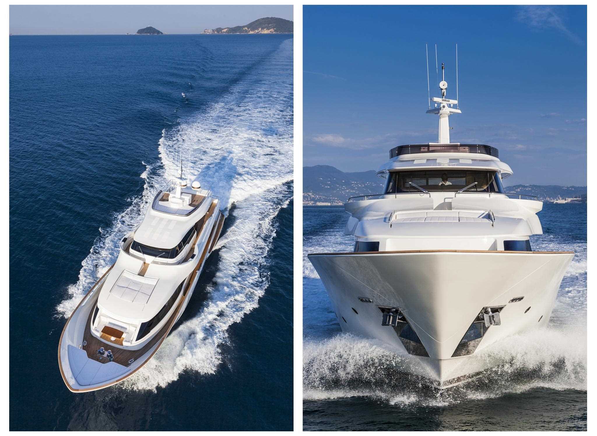 The Navetta 28 is recognisable from the unmistakable exterior profile and the panoramic dining area with round glass sliding doors which allow for great flexibility in the use of the upper deck. The large sunbathing area is a comfortable private deck, which on request can be fitted with a Jacuzzi tub and awning. On the main deck, a continuous window goes from stern to bow, while below deck there are four innovative hull windows at the level of the guest cabins, installed for the first time on the market, with “invisible” portholes glued onto the glass itself. The real cutting-edge innovation is in the stern area. The Dual Mode Transom (DMT), a Ferretti Group patent, combines in a single system a floodable garage, a diving platform and a spacious Beach Club, actually the largest ever on yacht models this size. When guests walk into the salon, they are welcomed by a large, carefully structured open space. Starboard you have the galley, towards the bow, you reach the area reserved to the ship owner with a large bathroom. Below deck you have four guest cabins, three of which with double beds (the two stern cabins can have twin beds), all of them with en-suite head. Also the audio/video equipment is state-of-the-art: “VOTIS” (Videoworks One Touch Infotainment System) makes it possible to control via iPad the whole entertainment system on board, replacing through a single support all the remote controls for the various devices on board. This control can also be extended to other areas on the yacht. As for powering, the twin MAN V8 engines at 1.200 mhp allow for a top speed of 16 knots and 13,5 cruise speed. As standard the yacht is fitted with underway electro-hydraulic fins for navigation and gyro stabilisers. On request – and fitted on the first unit – it is possible to install “zero-speed” fins, for a further alternative comfort mode while the yacht is moored at anchor.