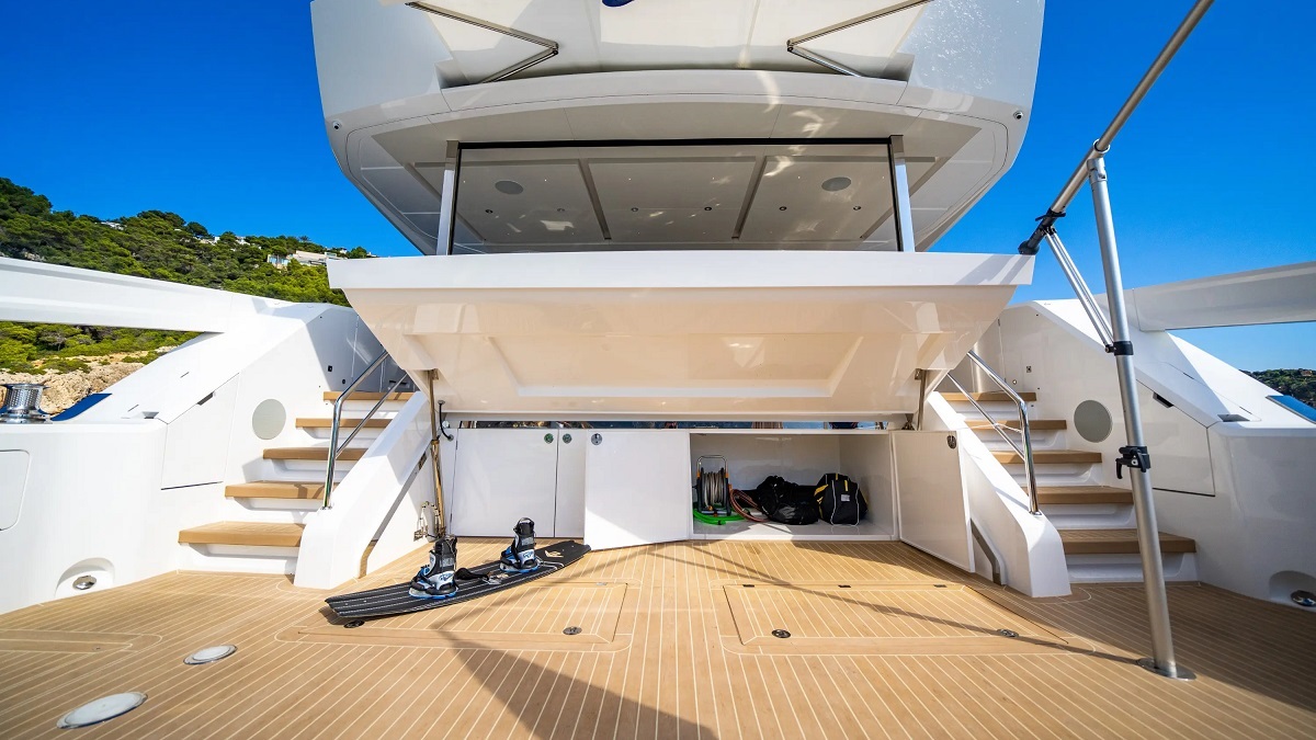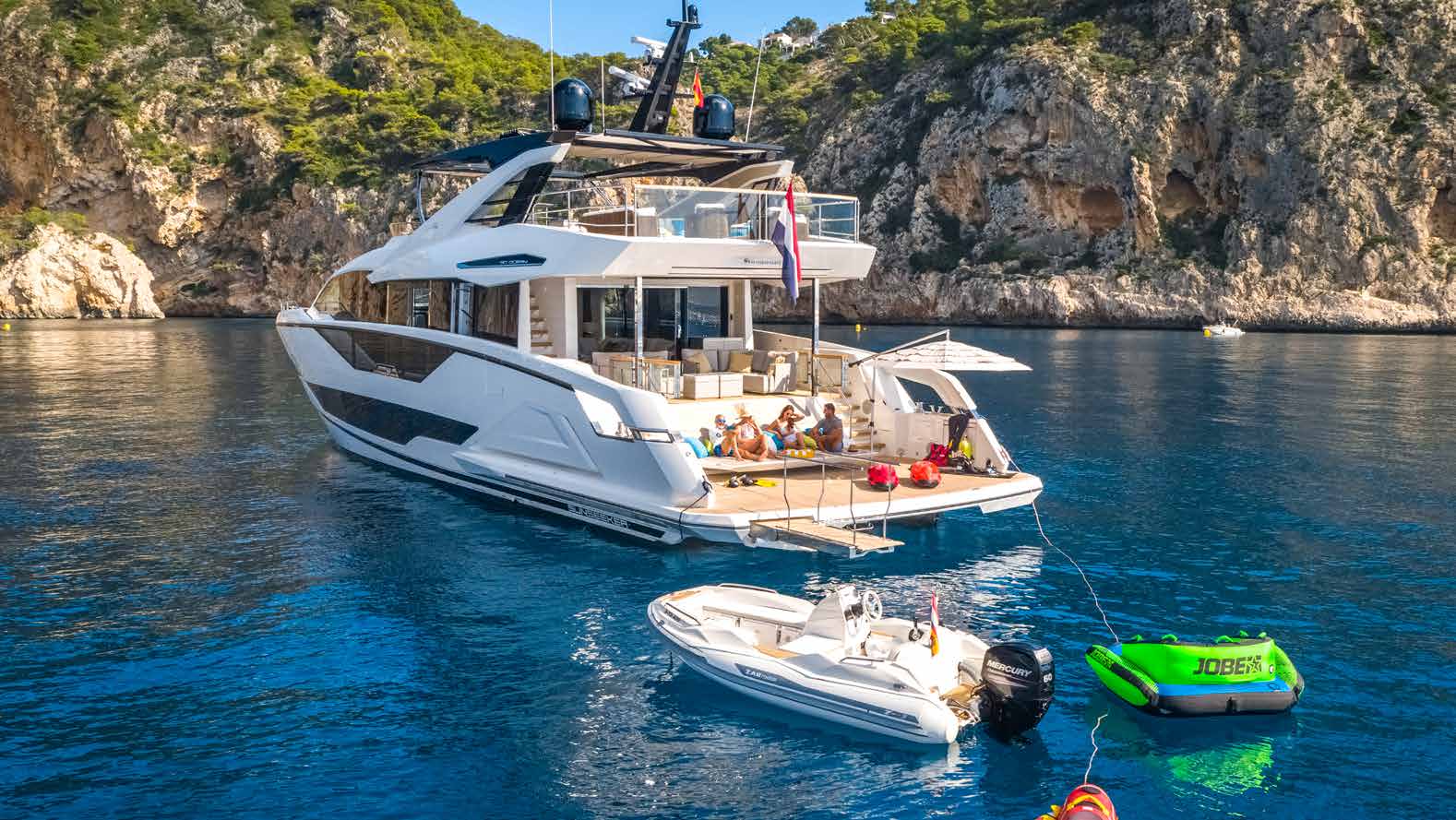 A Great opportunity to beat the waiting list and save on the new price. The Sunseeker 90 Ocean has pushed the boundaries of what a 90ft boat can offer in terms of volume and is one of the most exciting new models to leave the Sunseeker Factory moving into the next Generation of technology and interior design and the Sunseeker 90 is possibly the finest example built to date. She is offered for sale in as new condition having only been privately used from new and professionally maintained by her full-time captain and crew. Her specification is extensive including the Flybridge Hot Tub, Larger MAN Engines with 5-year extended warranty, and the Award winning Sunseeker Xtend™ system. The Sunseeker Xtend™ System forms part of a truly superb transom area which measures over 6M in width and offers vast entertaining space for family time with water toys, including a Williams 460 Jet rib and a Yamaha Wave runner Jet ski. This area is also shaded by an overhead electric canopy and a removable parasol. Her interior is finished in Smoked Figured Eucalyptus and with complementing soft furnishings the spacious interior offers outstanding living space that would normally be found on a much larger yacht.